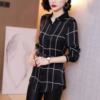 微尚瑶衬衫女秋季新款气质格子方领长袖系扣修身衬衣女时尚百搭中长款休闲上衣女7338 格子 请拍正确尺码 |