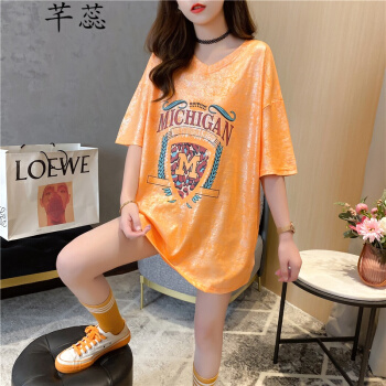 芊蕊t恤女短袖夏季新款韩版宽松印花字母中长款大码女装胖MM半袖打底上衣服 2389杏色 M |