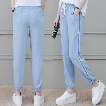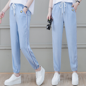 茉玥天丝小雏菊牛仔裤女夏季新款直筒松紧侧条纹运动休闲九分裤子 蓝色 请拍正确尺码 |