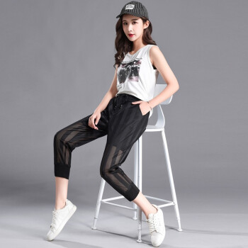干如鑫休闲裤女运动裤女夏季新款时尚网纱哈伦裤子女学生显瘦七分裤宽松运动百搭高腰大码灯笼裤女潮 图片色(黑色) M(90-100斤) |