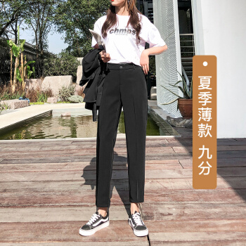 浪莎休闲裤女薄款夏季九分西装哈伦裤子宽松高腰工作直筒女裤 黑色 XL |