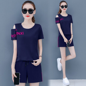 蕴之婧 新款运动休闲套装女大码女装夏韩版宽松ins潮显瘦小个子棉两件套短袖T恤短裤女 宝蓝 L(建议90-105斤左右) |