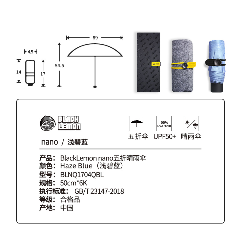 五折晴雨伞【碰击布+黑胶涂层/浅碧蓝】 |