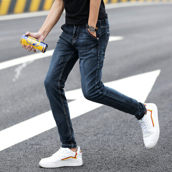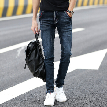 牛仔裤男春夏修身小脚裤男韩版休闲裤子男士潮流水洗牛仔直筒长裤青少年百搭运动裤男装 002蓝黑 30码-2尺3 |