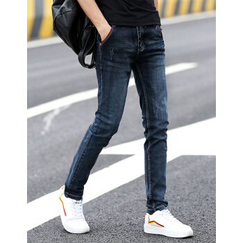 慕思莱牛仔裤男春夏薄款男装男士修身透气潮流长裤韩版休闲弹力破洞小脚裤子男生直筒宽松长裤夏季男裤 02深蓝色 31码-2尺4 |