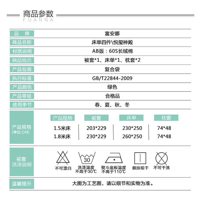 悦玺神殿 床单四件套(被套1件床单1件枕套2件)(适合1.5米床)【60支长绒棉/绿】 |