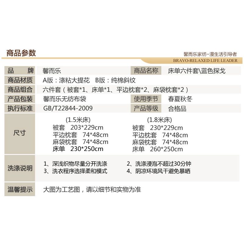 蓝色探戈 床单六件套(被套一件床单一件枕套四件)(适合1.8米床)【涤粘提花/蓝】 |