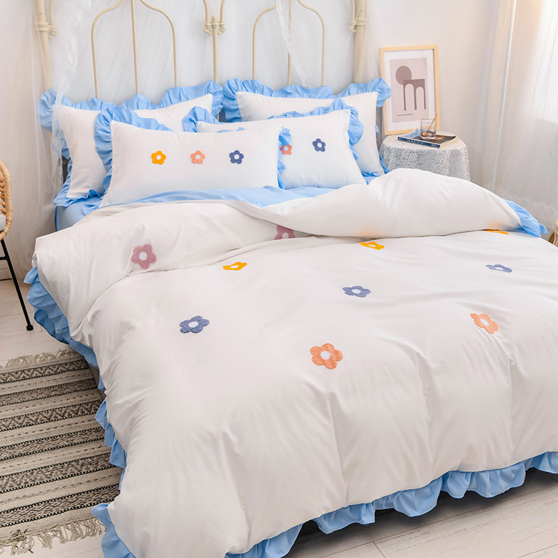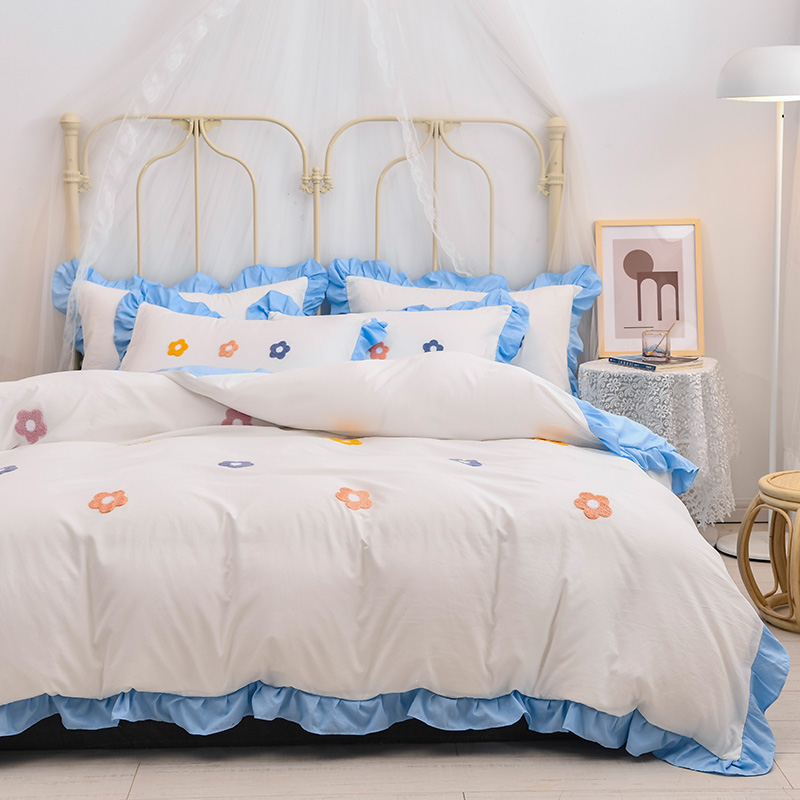 【锦软贴身】泫雅花毛巾绣荷叶边四件套【聚酯纤维/泫雅花-白蓝】 |