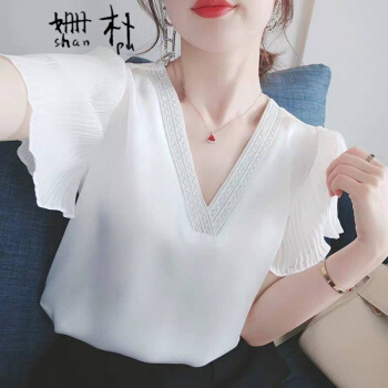 姗朴 雪纺衫女夏季新款大码女装印花雪纺洋气上衣宽松显瘦小衫短袖休闲时尚仙气V领港味荷叶袖衬衫 白色 L |