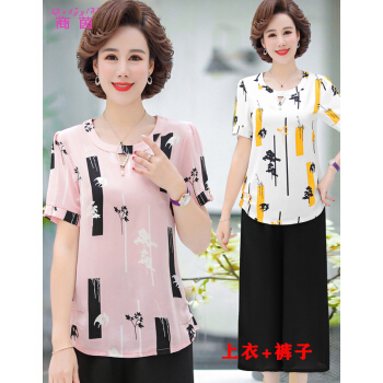 商茵SY中老年女装妈妈装新款夏装短袖衬衫减龄洋气雪纺衫中年人t恤中老年女装上衣+裤子套装 粉红色+阔腿裤 2XL【建议105-120斤】 |