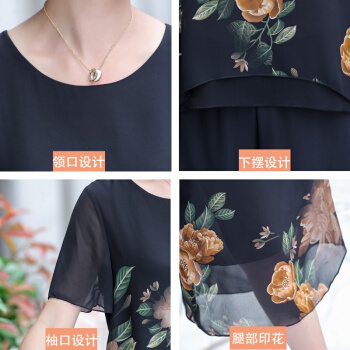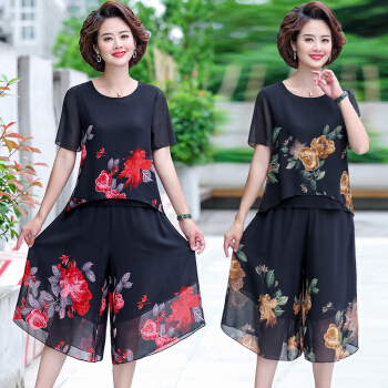 晳馥香中老年女装妈妈夏装两件套连衣裙女大码新款40岁50中年女装雪纺衫短袖t恤洋气套装 红花 (请拍对应尺码) |