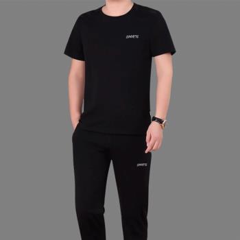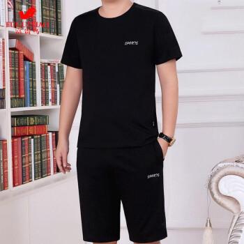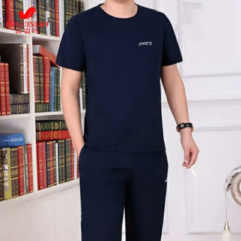 富贵鸟短袖t恤男套装夏天圆领修身半袖打底衫上衣服男装半截袖体恤polo衫 蓝色(短袖+长裤) 4XL(175-195斤) |