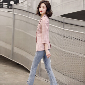 简草 小西装女秋季新款时尚韩版气质百搭修身休闲格子一粒扣单层小西服短外套女X8012 粉色 2XL |