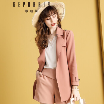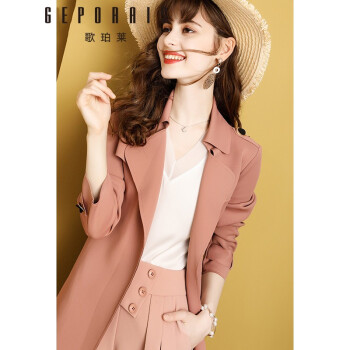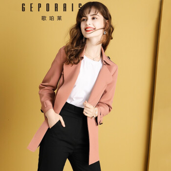 歌珀莱品牌女装中长款风衣外套女新款秋装气质英伦风小个子大衣外套 烟粉色 S |