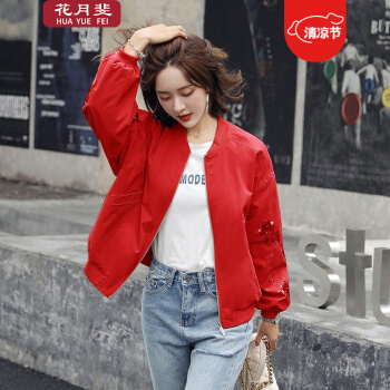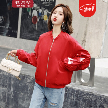 花月斐刺绣短外套女新款韩版宽松亮片棒球衫简约显瘦女士外套1992 红色 L |