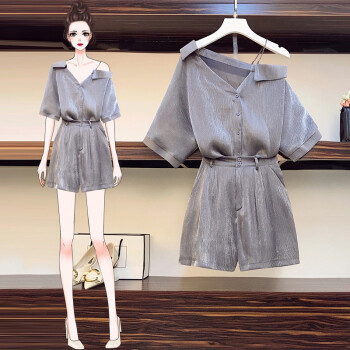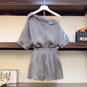 香爱蜜 时尚大码套装女夏装新款气质宽松衬衫女短袖T恤洋气减龄胖妹妹阔腿短裤梨形两件套装 银灰色 L建议90-105斤 |
