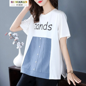 木棉林胖妹妹mm上衣女加大码女装新款夏装200斤遮肚短袖洋气拼接中长款T恤女H202633 白色 2XL建议140-160斤 |