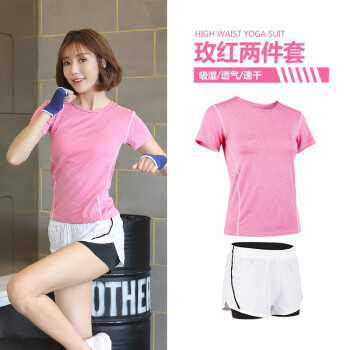 越伦 运动套装女夏季新款跑步服瑜伽服套装吸汗透气女速干健身服户外健身显瘦修身两件套 玫红短袖+白色短裤 M(80-90斤) |