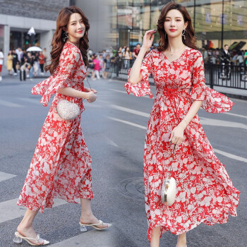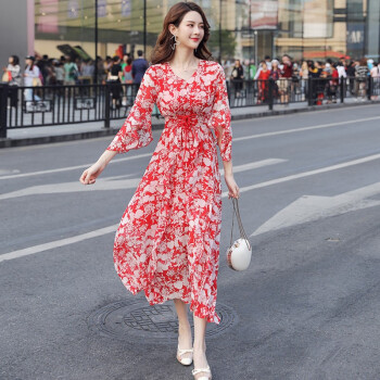 若玲珑网红碎花雪纺连衣裙新款夏收腰显瘦荷叶边气质小清新甜美超仙长裙 红花 M(建议90-105斤) |