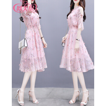 欧芙伦碎花雪纺连衣裙女夏季新款韩版时尚气质显瘦减龄收腰中长款裙子女5935 粉色 M |