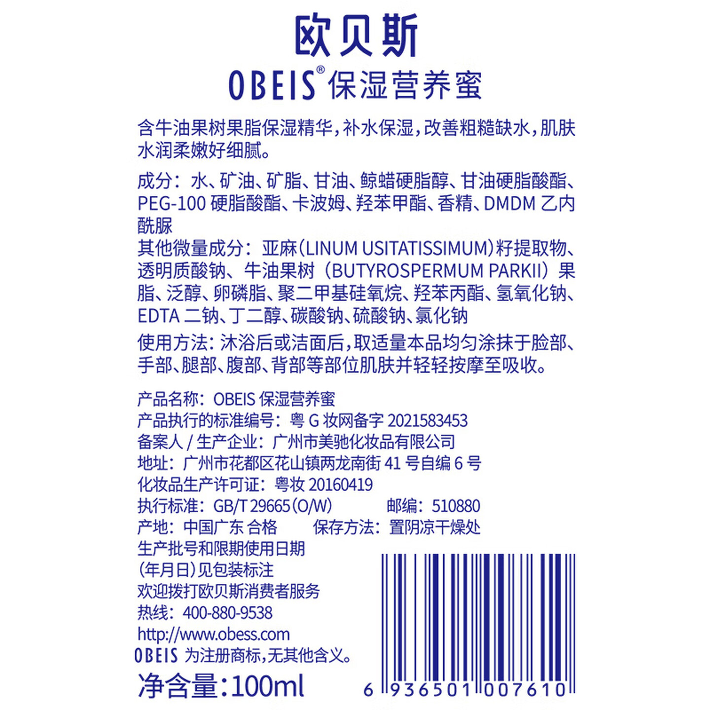 欧贝斯(obeis)保湿营养蜜滋润牛油果乳润肤乳100ml 脸手霜 |