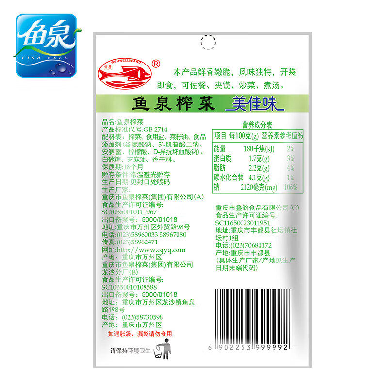 鱼泉榨菜清淡美佳味榨菜丝 80g*10袋 |