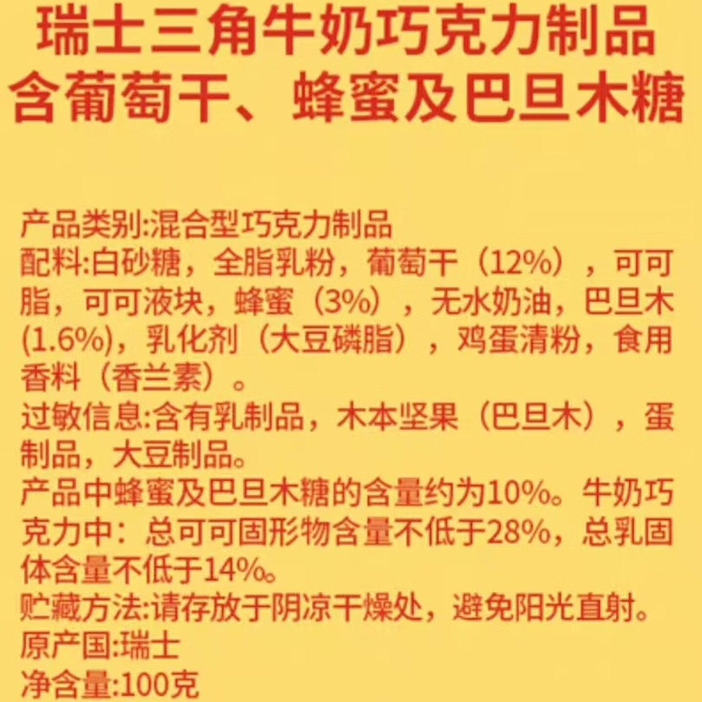 三角牛奶巧克力制品含葡萄干蜂蜜及巴旦木糖100g |